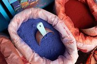 zakken met verfpigment in verschillende kleuren te koop in een Marokkaanse straatmarkt. Chefchaouen