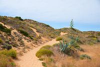 zandpad door duinlandschap, west algarve Portugal. blauwe lucht met kopieerruimte. agave planten met bloesem