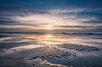 Tijdens de korte dagen in de winter een beeld van de Noordzee met het Noordzeestrand tijdens een zonsondergang . Bijzondere zandstructuren op het Noordzeestrand met het zeewater en het zand.
