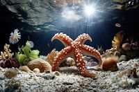Zeester op de bodem van de oceaan, met koralen, planten en vissen. Het licht van het wateroppervlak schijnt door het water.