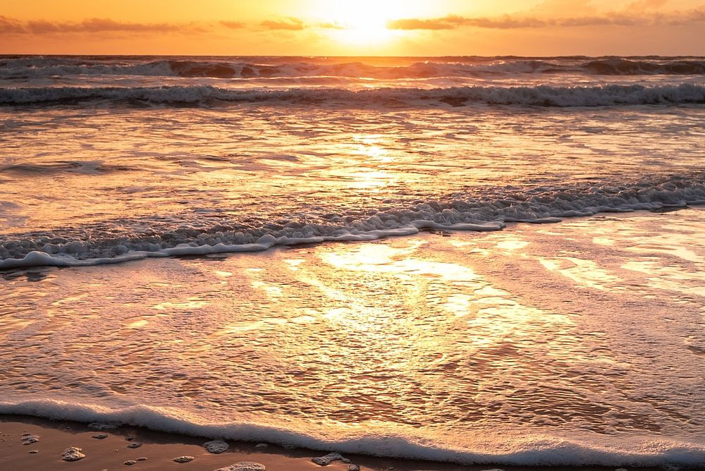 Ergens aan de kust op het strand zakt de zon in de zee. de fantastische zonsondergang geeft door de bewolking een fijn kleurenbeeld. op de voorgrond raken kleine golfjes het strand.