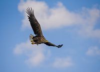 Deze zeearend in gefotografeerd vanuit ene boot in het oosten van Duitsland. Hij dook vanuit de vlucht het water in om een prooi te slaan.