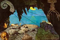 liggende collage in zwartbruine, grijze en blauwe tinten, vanuit een donkere grot kijken we naar een felblauwe zee waar een baan zonlicht op valt, aan de uitgang van de grot ligt een vrouwenfiguur in zwijm op de keien, rechts vooraan een rots met een zonbeschenen stadje erop,…