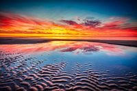Een zeegezicht met een kleurenpalet aan kleuren na de zonsondergang, met zicht op het strand en de Noordzee. Met ook een kleuren reflectie van de wolken in het zeewater.