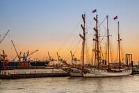 Loth Lorien en Tolkien de twee grote schepen in de haven van Hamburg bij zonsondergang.