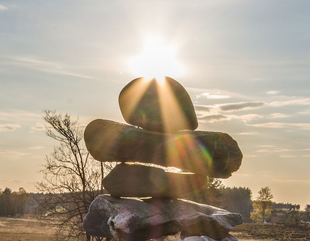 stenen stapelen met zonsondergang op te teut in zonhoven .mooi natuurgebied met prachtige heide lanschappen
