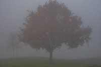 jonge eikenboom in een hersft kleuren jasje in de vroege ochtend mist .tegelijk weer een zenn moment maar ook rust en serene sfeer ter plaatse door de stilte op zo een ochtend .
