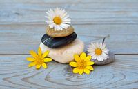 Serene afbeelding met zen en stapel stenen met madeliefjes en boterbloemen op een blauw grijze houten achtergrond