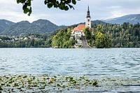 zicht op beroemde kerk in het meer van Bled in Slovenië