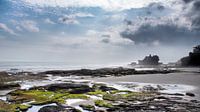 Zicht op de tempel Tanah Lot vanaf een afstand. Tanah Lot als silhouet zichtbaar met op de voorgrond vulkaan gesteente met mossen begroeid