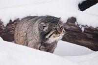 Koop de foto zit ontevreden in de sneeuw. Ernstige, wrede, pluizige, wilde kattenmanoeuvre op witte sneeuw. van Michael Semenov op canvas, aluminium dibond, (ingelijste) fotoprint, behang en ArtFrame, op maat geprint in Fine-Art kwaliteit.