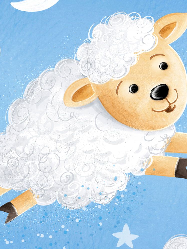 schattig schattig wit schaap dat met vlinder vliegt voor een blauwe hemel met maan in witte wattenwolken