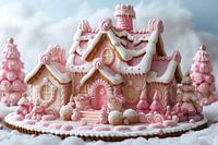 roze peperkoek huis met roze dak gemaakt van koek, chocolade en snoepjes en veel frosting