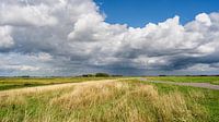 een mooie zomerdag met witte stapelwolken in een helblauwe lucht boven het uitgestrekte landschap van de polder Noordwaard in de Biesbosch....