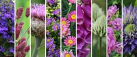 een kleurig palet van allerhande zomerbloemen in blauw, lila, purper, rose en wit. O.a. vingerhoedskruid en clematis.