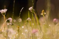 close up van met dauw bedekt gras en wilde bloemetjes, met bokeh