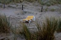 Tussen de hoge duingrassen staat een eenzame ligstoel met een felgele gestreepte handdoe, half verzonken in het koele zand. De omgeving is stil en leeg, alsof de zomer plots is vertrokken en enkel dit stille bewijs van warme dagen heeft achtergelaten. De zachte kleuren van het duinlandschap contrasteren mooi met het zonnige geel van de…