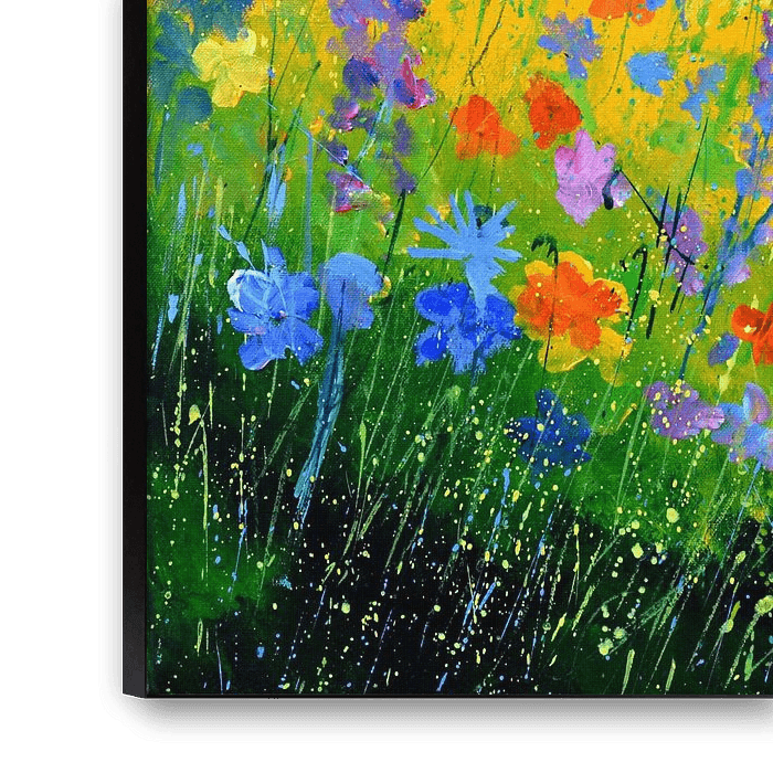 Dit levendige werk toont een bloeiende weide onder een diep azuurblauwe hemel. Schitterende tinten domineren het doek, met veelkleurige bloemen die dansen in een veld van levendig geel. De energieke penseelstreken geven het geheel een onmiskenbare vitaliteit en roepen beweging en leven op in deze pastorale scène. Toetsen van rood, paars en blauw verweven zich met het weelderige groen van het gebladerte, waardoor een opvallende visuele harmonie ontstaat. Het gedurfde kleurgebruik en de rijke textuur van het schilderij voeren de kijker mee naar een wereld van sublieme natuurlijke schoonheid. Dit werk viert de eenvoudige, levendige vreugde van de natuur, geherinterpreteerd met voelbare moderniteit. Het vermogen om de vergankelijke essentie van het seizoen vast te leggen maakt het tot een indrukwekkend en onvergetelijk artistiek testament.
