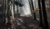 een oude kar staat in de bossen in de mist met ochtendlicht