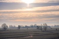 landschap in Homoet, Gelderland, vanop een brug gefotografeerd, met een winterzonnetje dat prachtig schijnt over de akkers