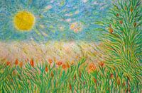 Een geschilderd landschap beschrijft het samenspel van zon en plantenwereld. Hier de energie, daar de opname en transformatie ervan. Hemel met zonnevlekken, weide met bloemen en struiken. Er hangt een warme, zomerse bries in de lucht.