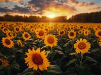 zonnebloemveld bij zonsondergang met dramatische lucht