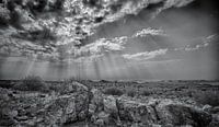 zonneharp boven namibië. In de namib woestijn van namibie kom je de mooiste vergezichten en landschappen tegen en dat vaak in combinatie met een prachtige wolkenlucht of een spectaculaire zonsondergang. Deze dramatische wolkenlucht, uitgevoerd in zwart-wit laat een mooie zonneharp zien.