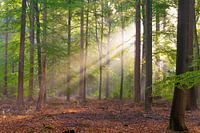 mooie zonnestralen door de bomen met vers groen blad. en stiekem zie ik de bladeren al bruin kleuren en is dit ook een prachtige herfst locatie.