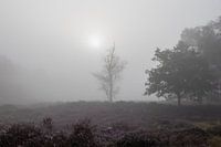 zonnetje prikt door de mist boven paarse heideveld van Peter Haastrecht, van