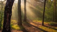 Zonnige ochtend in het bos. De stralen van de zon spelen in de takken van de bomen. Mooi weer.