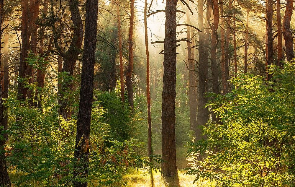 Zonnige ochtend in het bos doorboord door de stralen van de zon. Schoonheid van de natuur.