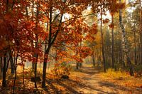 Herfstbos overspoeld met zon. Mooi weer. De zonnestralen spelen in de takken van de bomen. De herfst beschilderde de bladeren met haar kleuren.