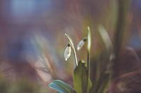 close up van twee sneeuwklokjes, die stralen in het zonlicht, wat zorgt voor een mooie kleurrijke bokeh achtergrond