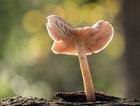 close up van een beige paddenstoel die uit een boomschors is gegroeid, en nu staat te schijnen in het zonnige herfstbos