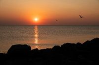 Ondergaande zon aan de Brouwersdam vanachter de rotsblokken van het piertje gefotografeerd bij de Noordzee, in de lucht vliegen meeuwen voorbij. De lucht kleurt mooi goud tijdens deze warme zomeravond.