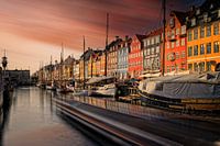 zonsondergang bij Nyhavn, een prachtige haven in het centrum van Kopenhagen. De haven wordt gekenmerkt door allerlei gekleurde huisjes en er liggen prachtige oude schepen.