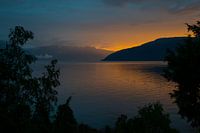 sognefjord in noorwegen met zonsondergang boven de bergen