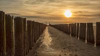 zonsondergang in zeeland bij zoutelande aan het strand met stormbrekers