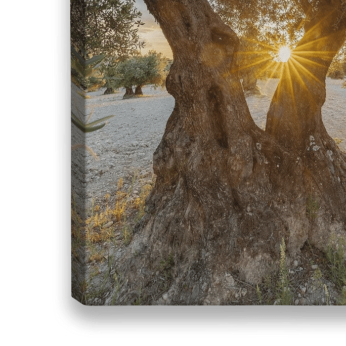 zonsondergang gezien tussen de olijfbomen met een doorkijk. De foto is genomen op een van de vele olijfboomgaarden in centraal Spanje nabij Madrid.