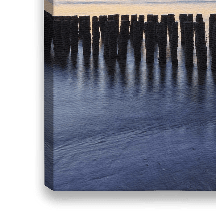 zonsondergang in Zeeland met een typisch Zeeuwse golfbreker van houten palen in de branding; Westkapelle, Nederland