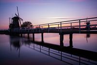 zonsondergang bij de molens van kinderdijk met een loopbrug en fraaie avondkleuren.