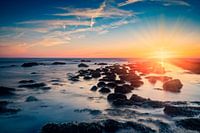 zonsondergang langs de Noordzee met een typische golfbreker in de voorgrond en door een langere sluitertijd lijkt er beweging in de golven te zitten, waardoor de foto een rustige sfeer uitstraalt