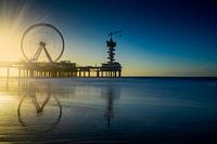 zonsondergang langs de kust van Scheveningen met het reuzenrad op de Pier op de achtergrond
