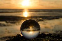 zonsondergang door een glazen bol aan het strand bij Noordzee aan de Brouwersdam