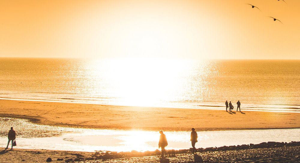 Een zonsondergang tijdens een prachtige zomeravond aan de Nederlandse kust. Aan het strand genieten mensen van de oranje gekleurde zonsondergang.