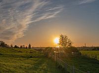 landschap in Heteren, Gelderland, met de weilanden van de uiterwaarden van de Rijn, en op de achtergrond de Peperbus toren en de ondergaande zon