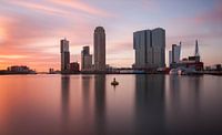 zonsondergang aan de rijnhaven met de skyline van rotterdam en een mooie gekleurde lucht.