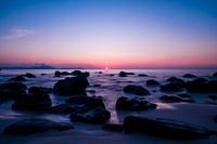 Een zonsondergang met lange sluitertijd. De zee wordt een gladde spiegel, de kleuren zijn prachtig. De zin is bijna onder de horizon. Een prachtig tropisch plaatje. De kleuren blauw, roze, paars en een beetje oranje voeren de boventoon in deze foto. Deze afbeelding is gemaakt in Sumatra op Pulau Weh in Indonesie. De rotsen op de voorgrond geven een prachtige diepte in het beeld. Er zijn bijna geen wolken aan de lucht te zien.