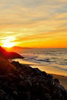Het schemert en de zon verdwijnt al gedeeltelijk achter de Spaanse bergen. Pracht beeld vanaf de kust bij Biarritz.