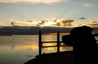 Zonsopkomst aan Grevelingenmeer aan de Brouwersdam bij Ouddorp in haventje met hond op voorgrond.